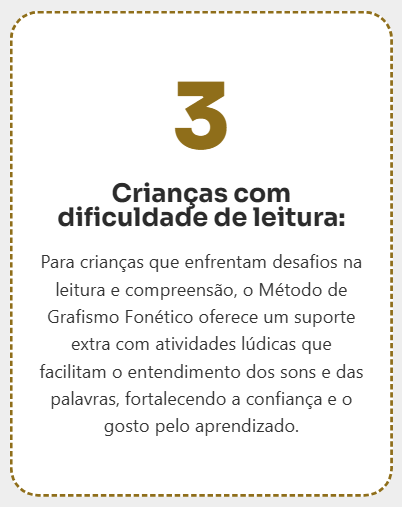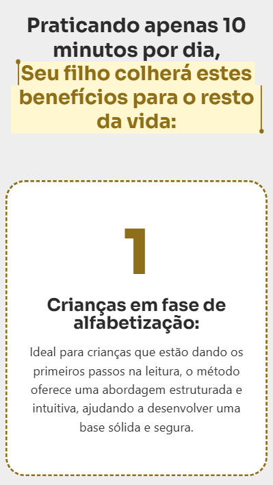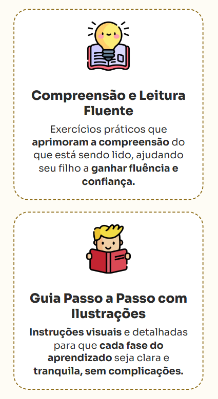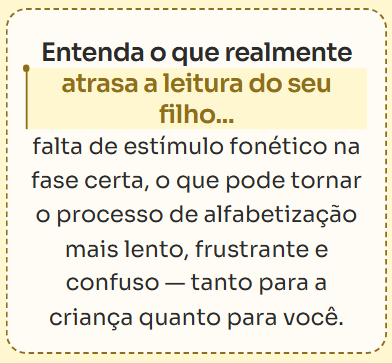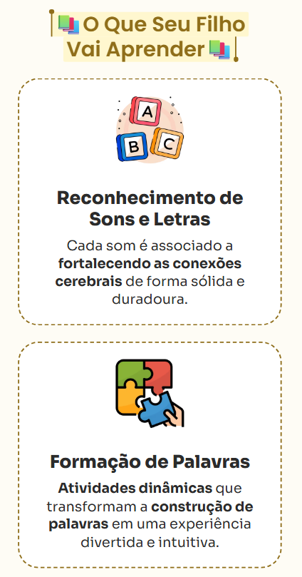 Com o Kit de Grafismo Fonético, baseado no método americano de alfabetização, seu filho aprende a ler até 5x mais rápido — de forma divertida, simples e eficaz, direto de casa!